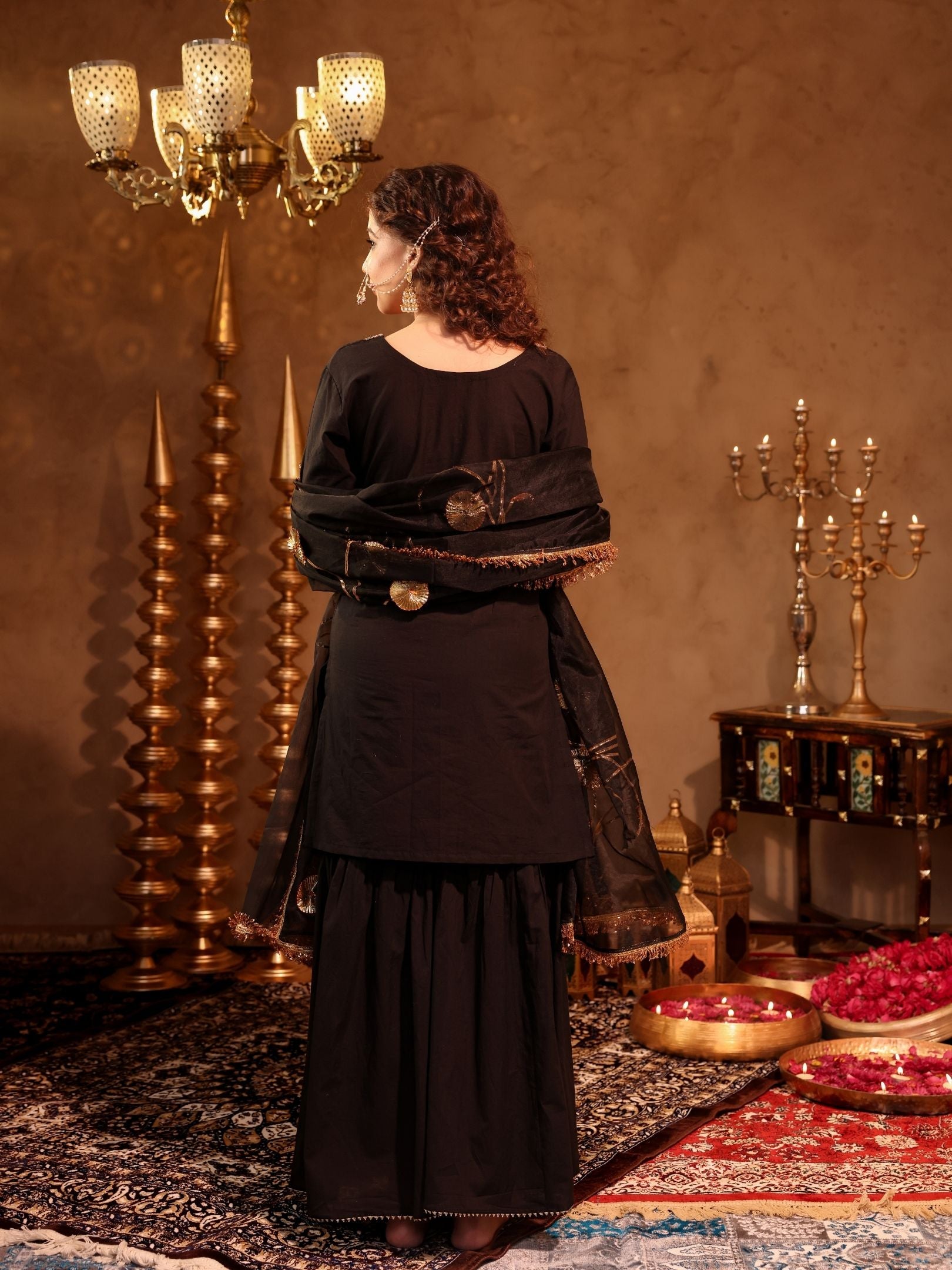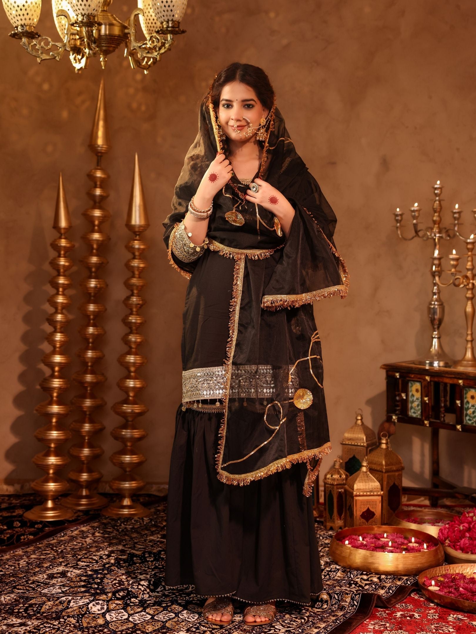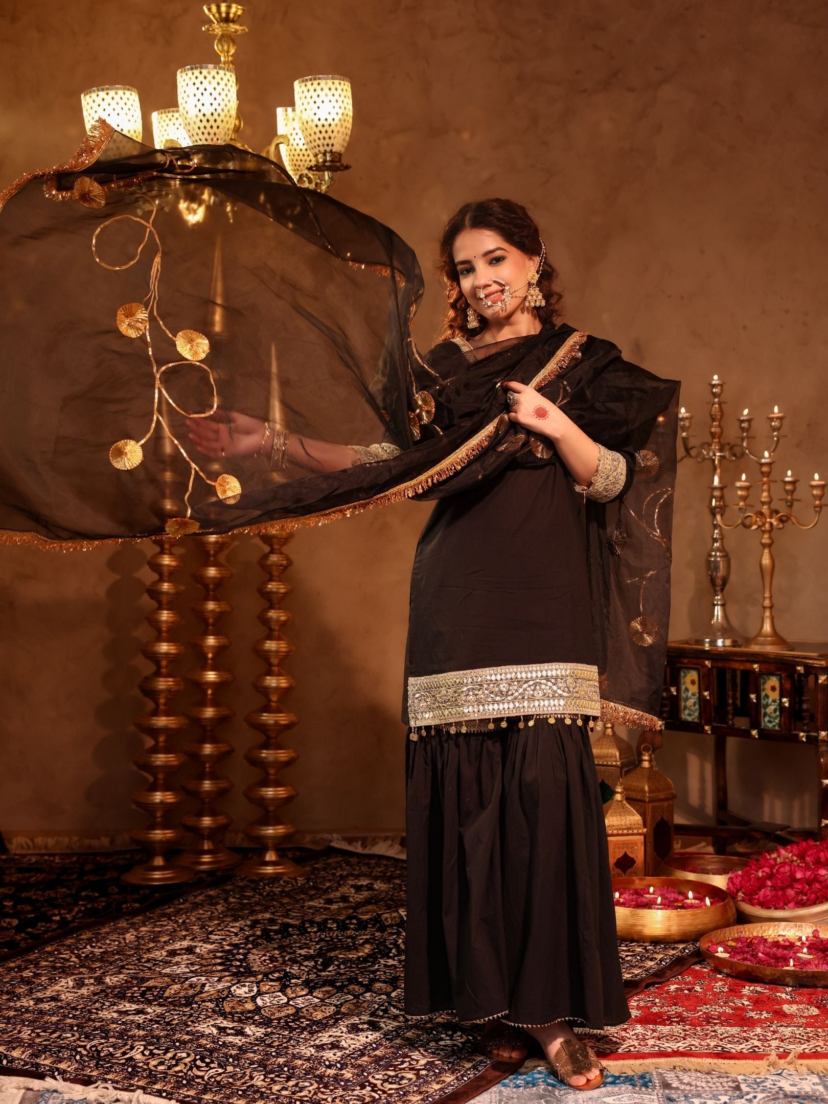 A sheer Organza dupatta completes the ensemble, highlighted with intricate Gota work on the borders and floral motifs, lending a sophisticated festive touch. Perfect for weddings, Diwali soirées, or evening festivities, this black Sharara Set is designed to make a lasting impression.