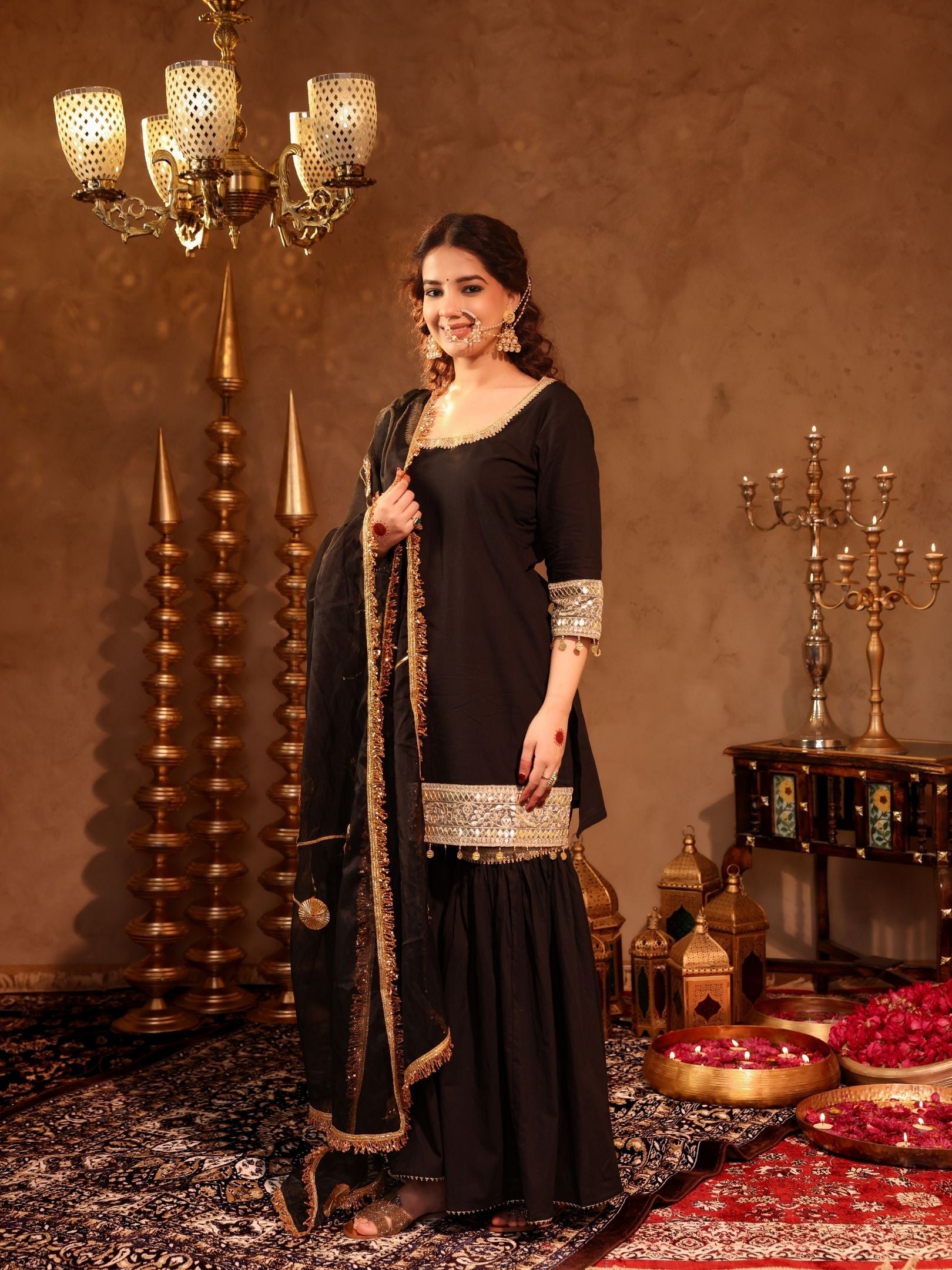 Embrace the elegance of black with stunning Asheera Black Gota Work Cotton Sharara Set, crafted for women who love timeless festive fashion. The kurta features a classic round neckline enhanced with delicate sequin lace work, while the 3/4th sleeves and Hem Line are finished with subtle Gota detailing for a regal charm. The flared pure cotton sharara bottom adds effortless grace and comfort, making it perfect for long celebrations.