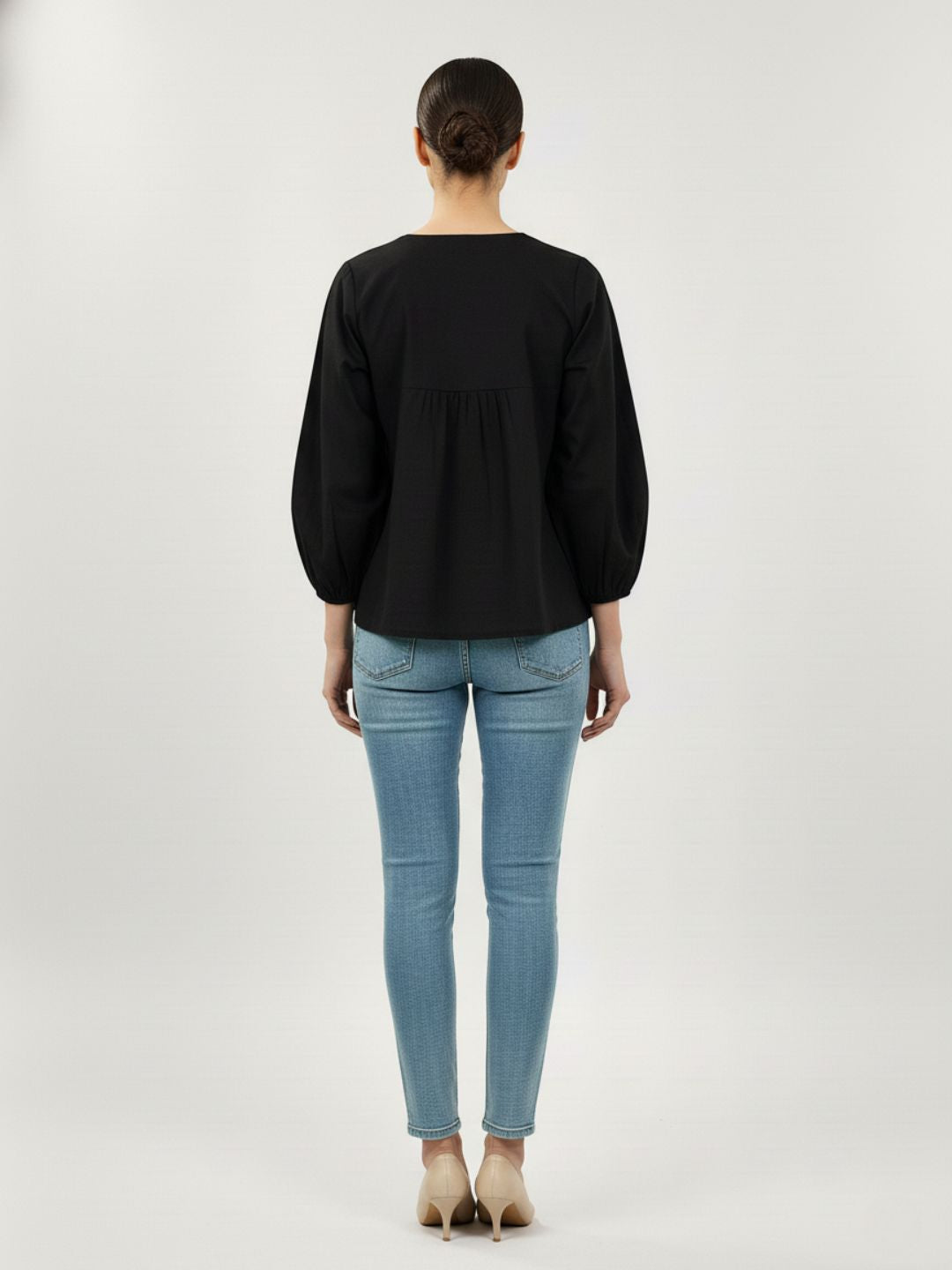 The tie-up neckline with tassels adds a playful yet classy detail, making it perfect for office days, café outings, casual evenings, or weekend travel looks.