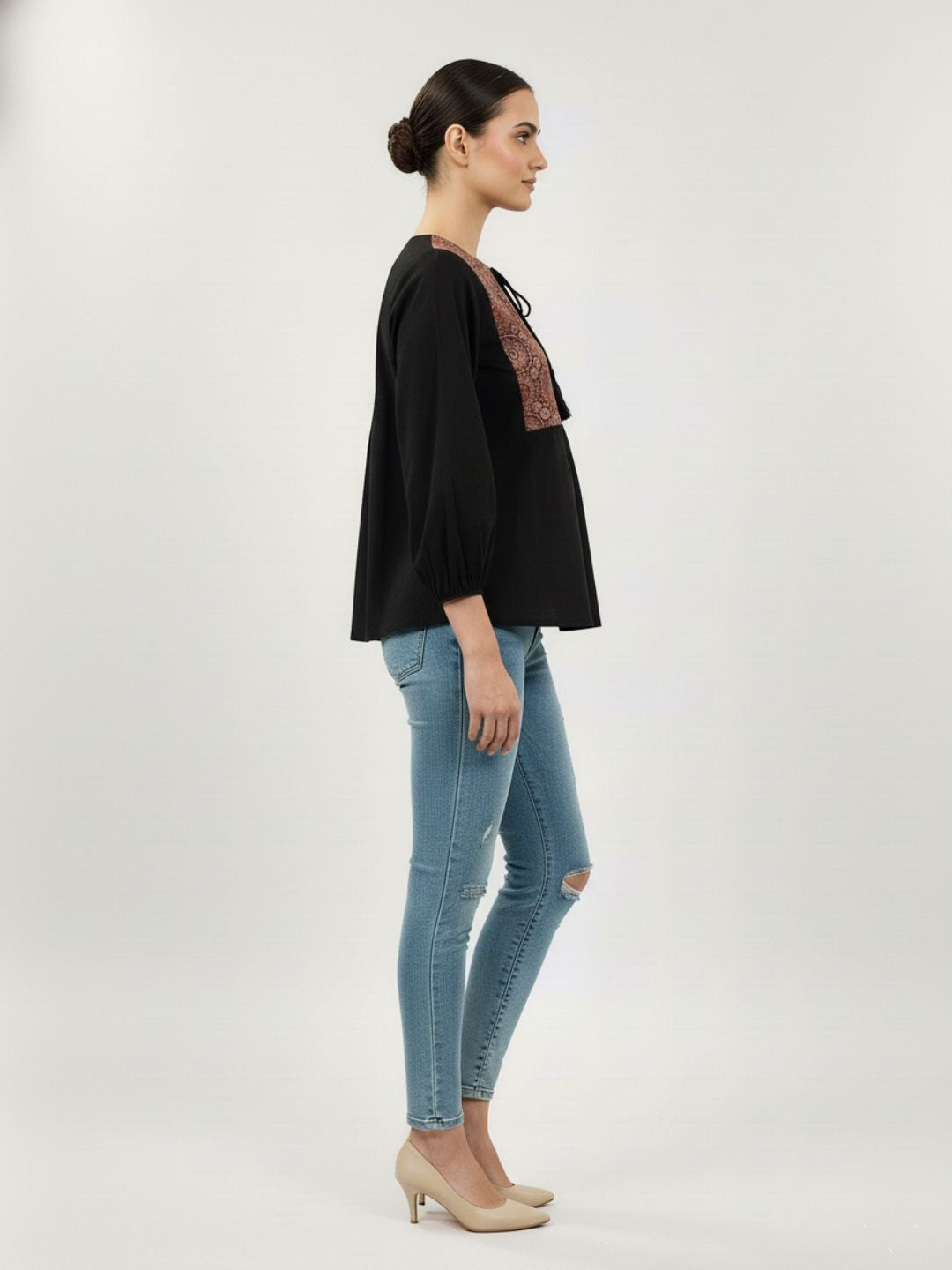 Discover a piece that blends timeless Indian craft with modern, easy-going style. This black cotton top, elevated with a beautifully hand-inspired Ajrak patch yoke, brings together tradition, comfort, and understated elegance in one silhouette.