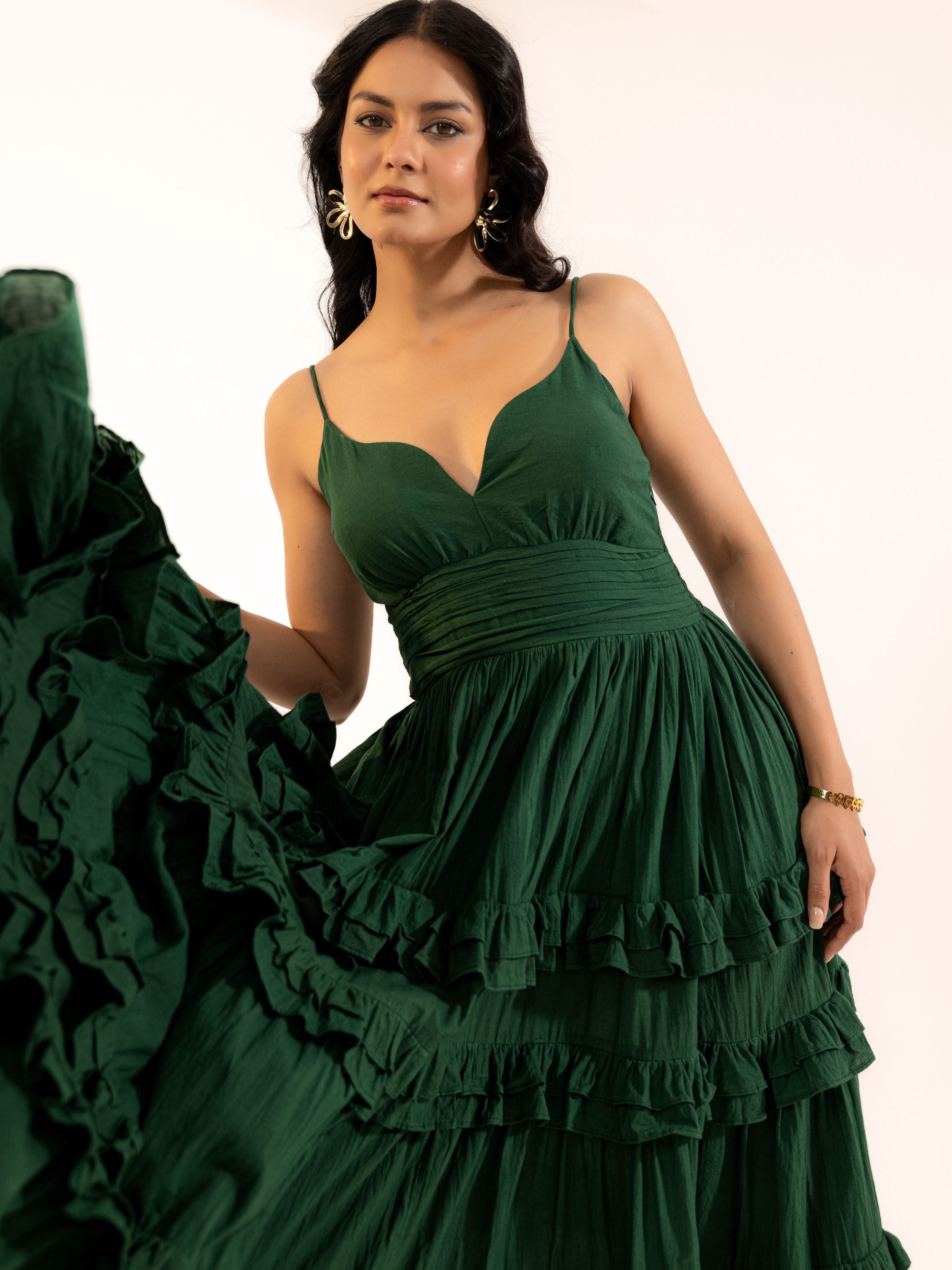Effortlessly elegant, this hand-crafted maxi dress is designed for the modern Indian woman who dresses with intention. The deep emerald hue, sweetheart neckline, and cascading ruffle tiers make it a statement piece — from festive gatherings to intimate celebrations.