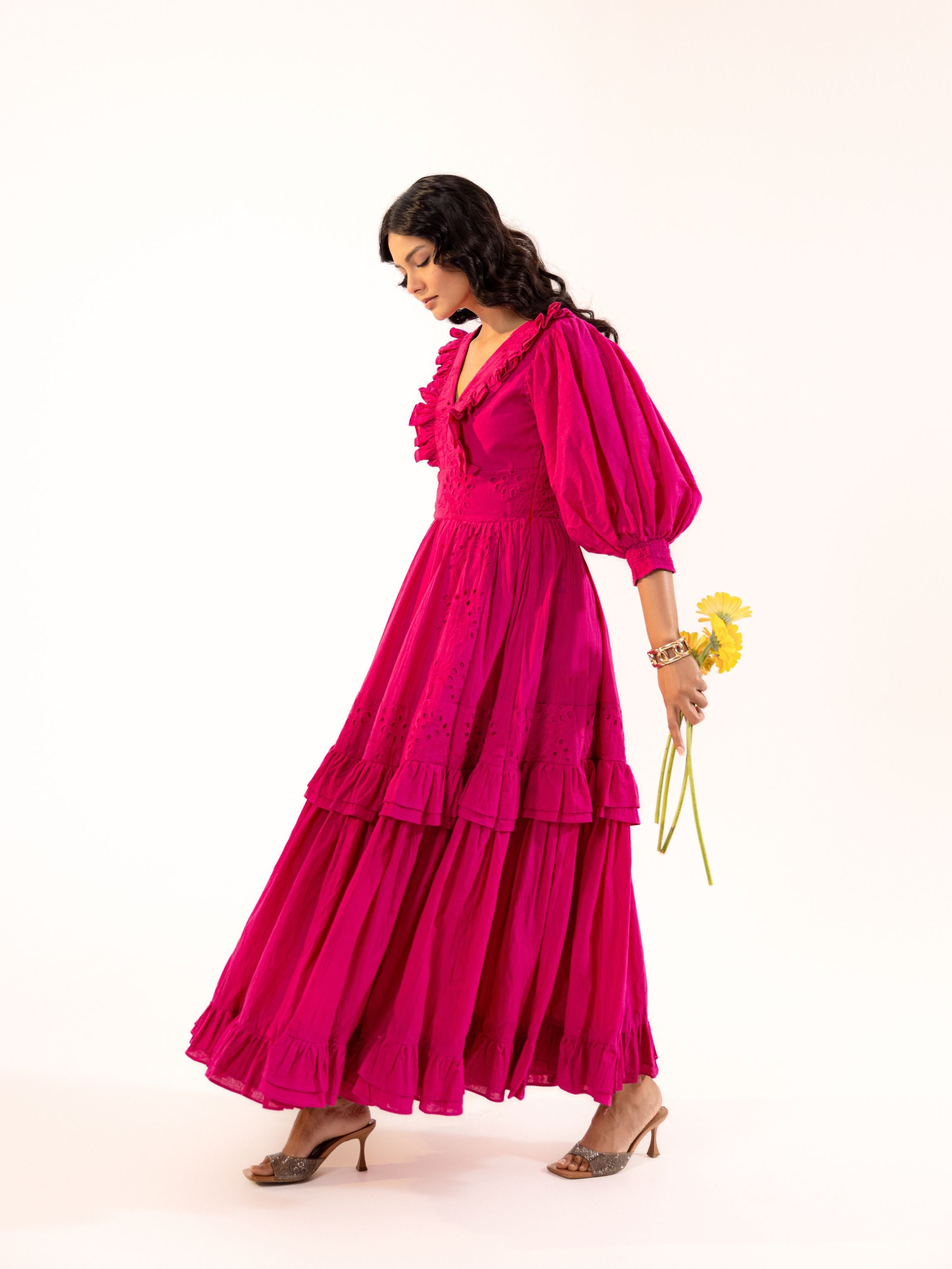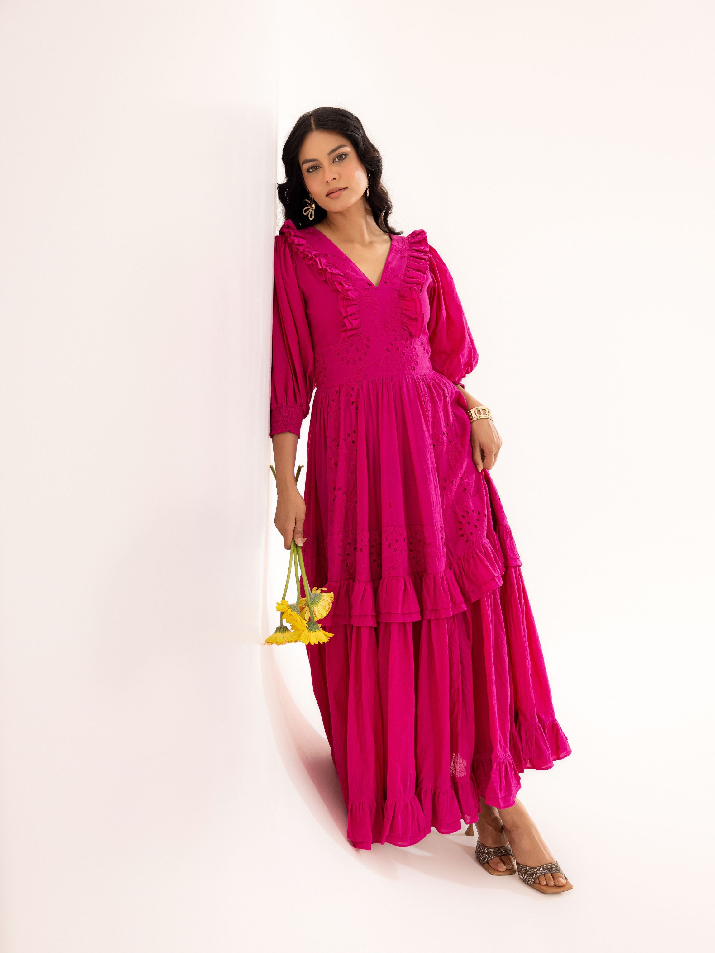 Command attention with this stunning magenta cotton tiered maxi dress featuring romantic ruffle detailing. Perfect for the modern Indian woman who loves to make a bold, unforgettable statement with vibrant elegance.