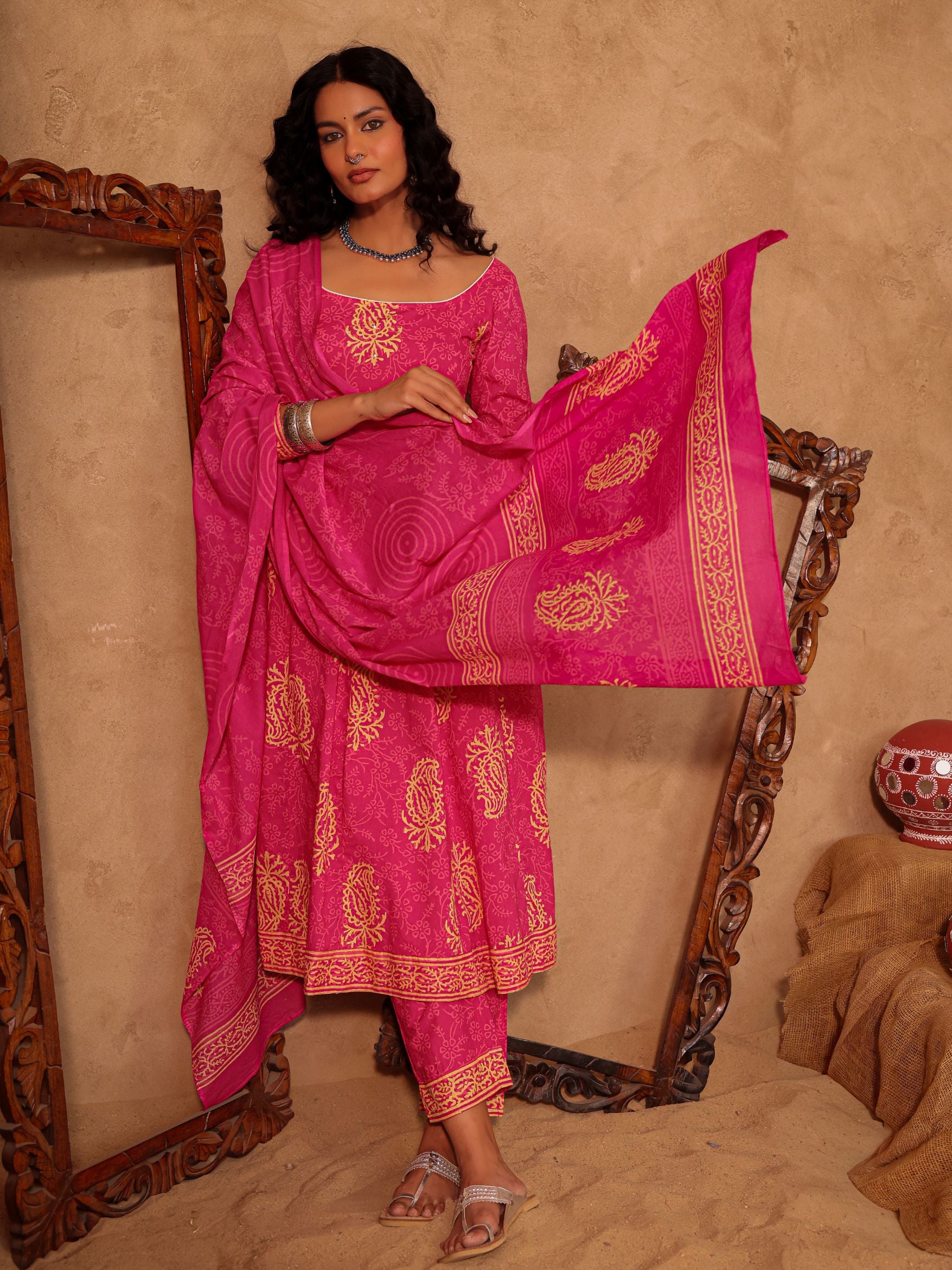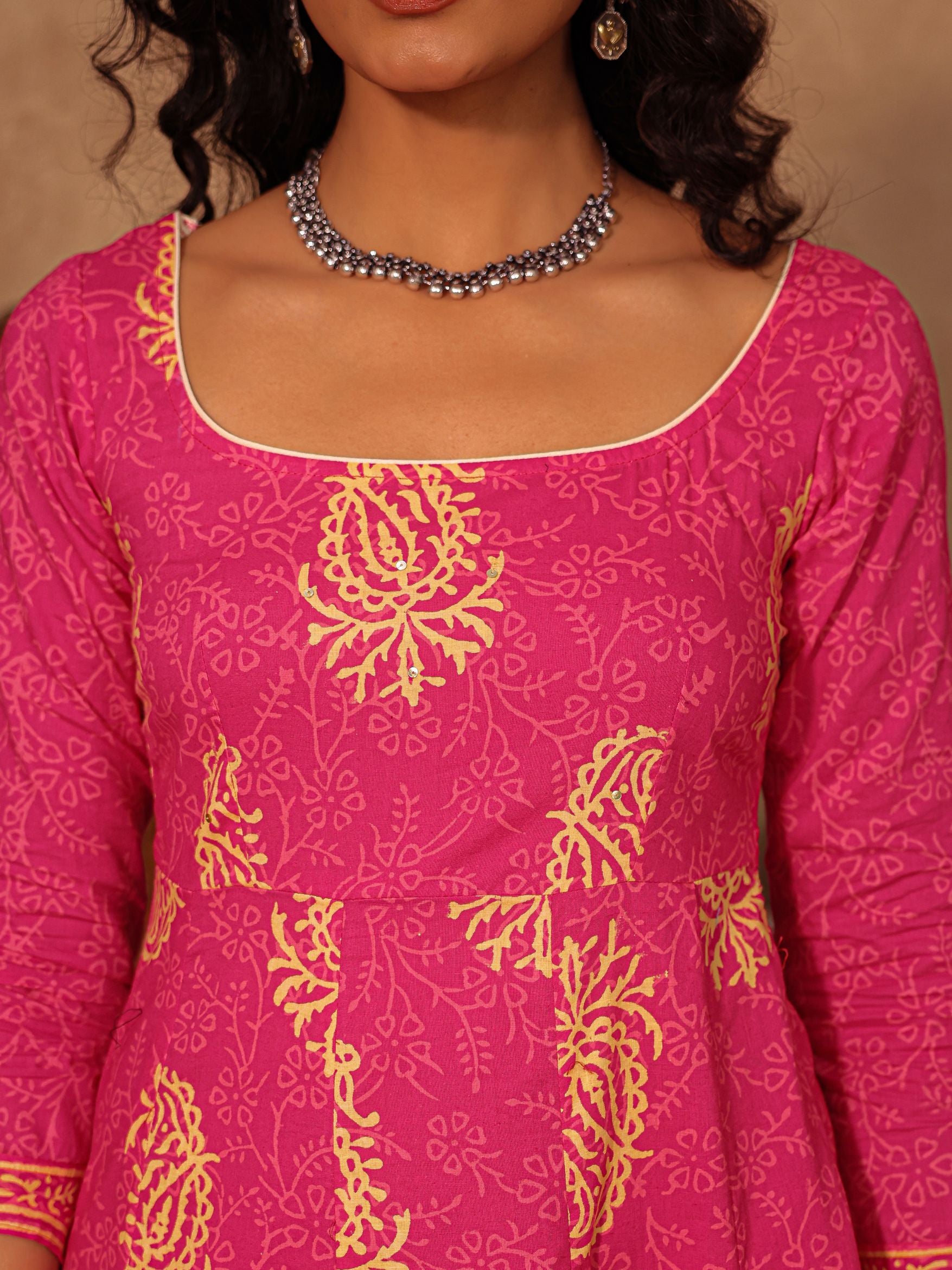 Bold, joyful, and deeply rooted in Indian craft tradition — this Fuchsia Pink Paisley Hand Block Print A-Line Kurta Set by ASHEERA is a celebration of colour and artisanship. The vibrant fuchsia base is adorned with an all-over golden Paisley (Kairi) Boota hand block print, a motif that has graced Indian textiles for centuries, rendered here with striking clarity and warmth.