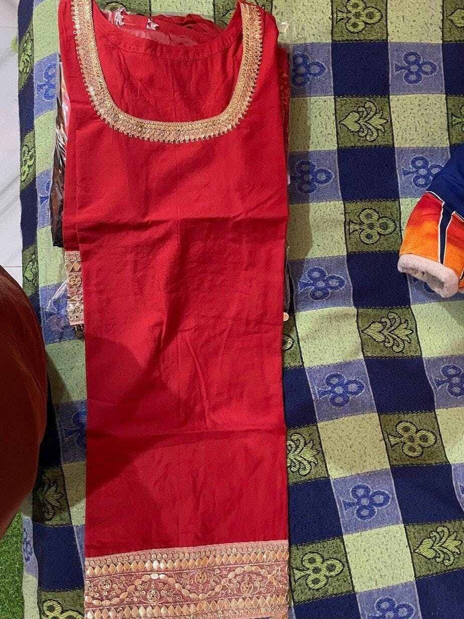 Elevate your festive wardrobe with the Laal Ishq Gota Work Sharara Set. Crafted from pure mul cotton in a vibrant red shade, this ensemble features exquisite gota work on the sleeves and kurta, complemented by delicate hand gota embellishments on the matching organza dupatta. The round neck and 3/4th sleeves offer a graceful silhouette, making it ideal for any celebration or party. Experience comfort and elegance combined in one stunning set.