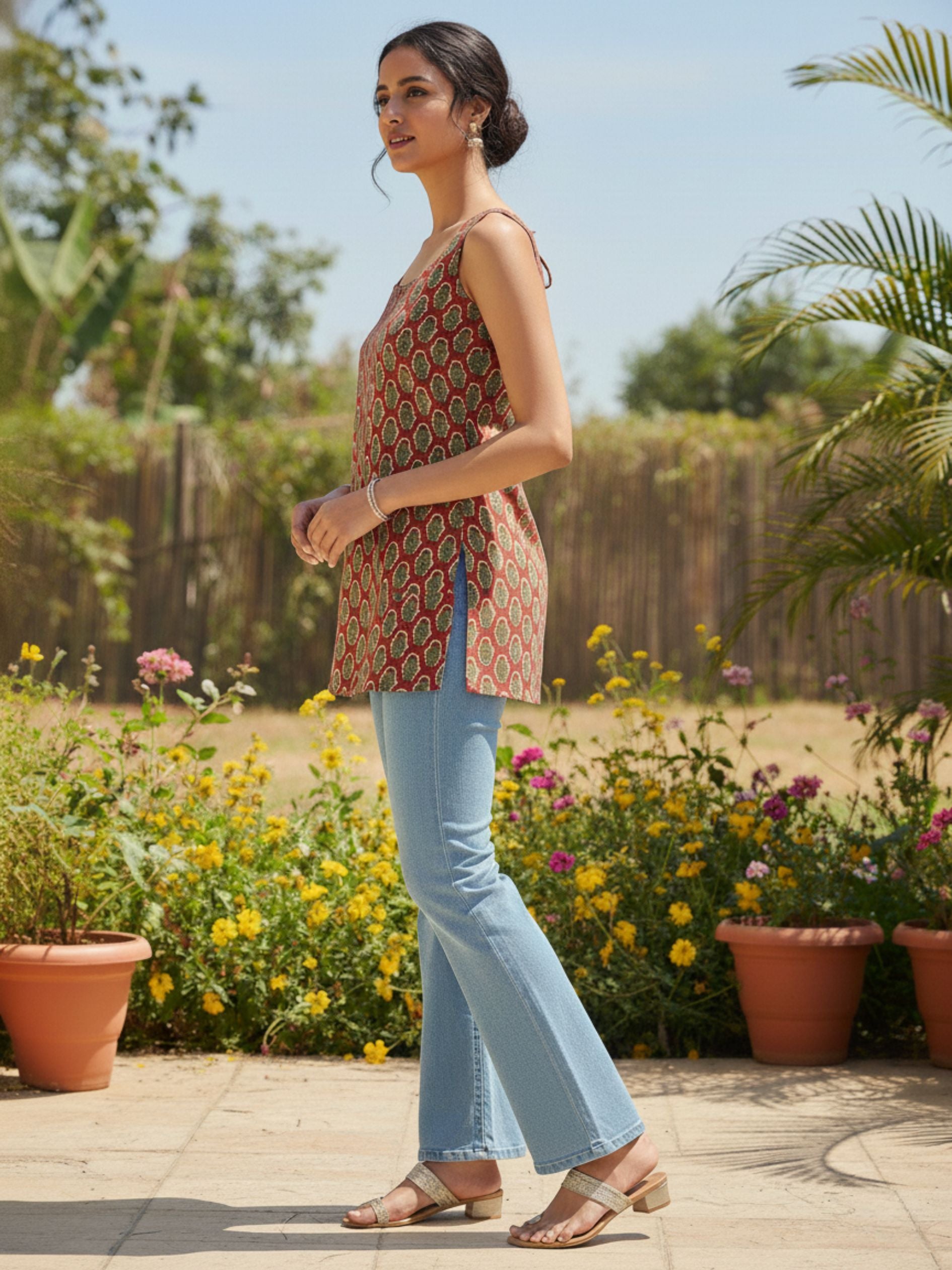 Designed with a stylish sleeveless square neckline, this kurti is ideal for women who love modern Indo-western silhouettes with traditional charm. Pair it effortlessly with jeans, pants, or straight trousers for a stylish daytime look.