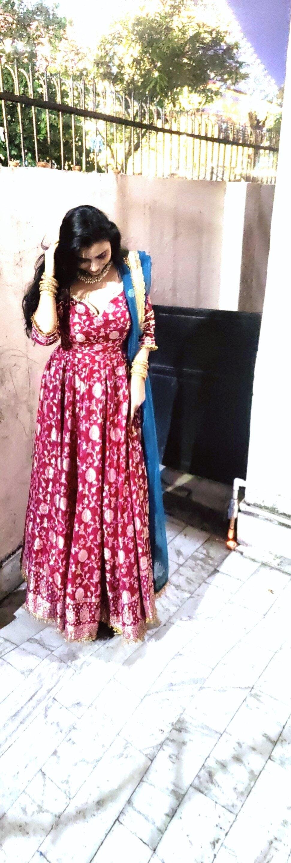 Crafted from premium Chanderi fabric, this Wine Jacquard Anarkali Suit Set features exquisite floral zari thread jacquard motifs that lend a timeless elegance. The matching dupatta is adorned with heavy gota and sequins work, enhancing its luxurious appeal. Designed with delicate noodle straps and a graceful sweetheart neckline, this ensemble combines sophistication with refined charm—ideal for making a distinguished statement at any special occasion.